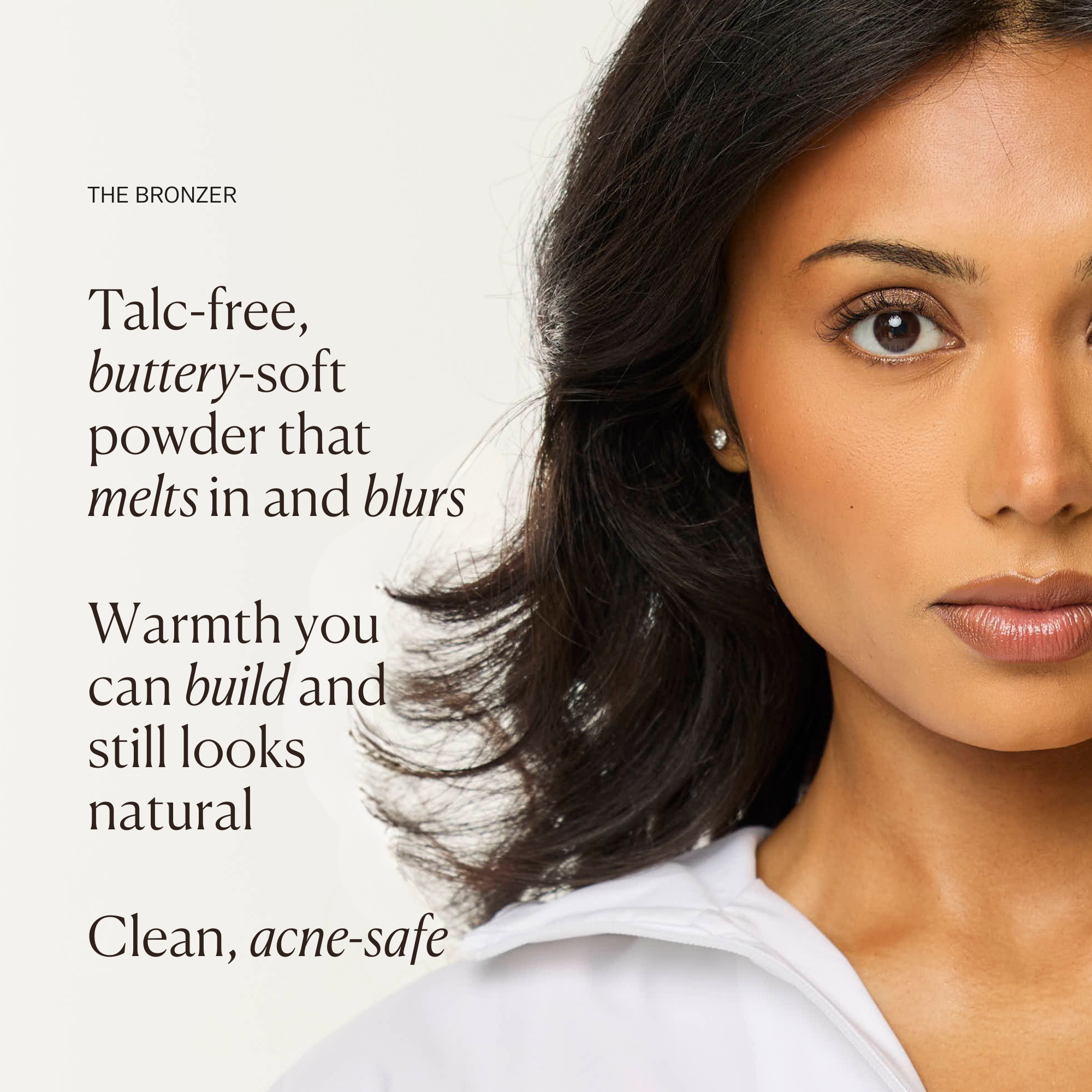 The Bronzer is a buttery-soft powder that melts into the skin for natural-looking warmth.