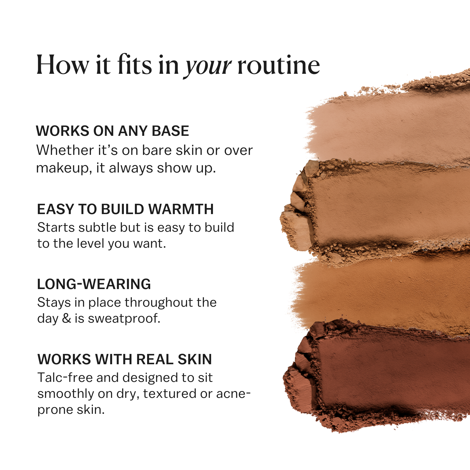 The satin-matte finish looks like skin, while the buildable formula lets you control the warmth without it ever looking overdone, or orange.